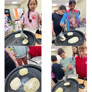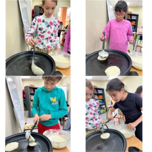 autour d’une spécialité algéroise : les « mille trous » (appelées aussi baghrir).Les élèves ont découvert cette délicieuse recette tout en apprenant, en arabe, le vocabulaire des ingrédients et des étapes de préparation. Ils ont ensuite rédigé la recette dans leur cahier, puis ont participé activement à l’atelier en versant eux-mêmes la pâte.
